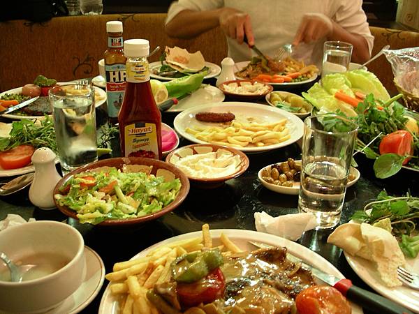 到了阿拉伯我們還真是沒有添加任何醬料的「純吃草」,然後開始研究阿拉伯的菜單,還好「杜拜」算是一個國際化的城市,所有的菜名都是蚯蚓文字與英文並列,不過中餐常見的煎、煮、炒、炸、燴、燉的料理做法這裡是完全看不見,大部分都是燒烤肉類或海鮮當作主菜再配上胡蘿蔔、青豆、薯條或焗番茄等副餐,於是就在吃了一大盆「純吃草」外加一份烤牛排,以及管飽吃的薄餅後,算是見識了阿拉伯當地的「風味餐」,我開始有點後悔為什麼不去吃那生魚片跟熱炒不分的「中國料理」,我也開始明白為什麼台灣沒有正統的阿拉伯「風味餐廳」,憑良心講,以中國人對美食的挑剔,阿拉伯菜可以說是上不了抬面的,這也跟阿拉伯的風土民情有關,試想,古時候阿拉伯遊牧民族生活在沙漠之中,他們的食物能有什麼變化,除了燒烤還是燒烤,而且主要是吃肉類跟薄餅,沙漠之中是沒有新鮮蔬菜可供料理的,所以我敢說阿拉伯人根本不會做蔬菜料理,由於阿拉伯國家拜石油之賜,國家有錢了,在阿拉伯也可以吃到新鮮蔬菜,因此基於健康飲食、營養均衡的道理,在傳統的阿拉伯餐廳,除了供應各色燒烤肉食外,他們也提供蔬果,但因為不知道怎麼料理,所以乾脆洗乾淨了就端上桌來,隨你怎麼吃,可是以中國人的角度來看,如果你到一家中國餐館,老闆端一盆生的蔬果上桌讓客人吃,而不是我們熟悉的蔬菜料理例如開陽白菜、炒空心菜、炒芥藍、炒豆苗,你會怎麼想,這生的蔬菜沒經過料理能吃嗎?要吃生的我直接到菜市場買何必上館子吃。這阿拉伯料理總算是見識過了,問同事下次還想不想再來,大家一致認為「僅此一次,下不為例」。