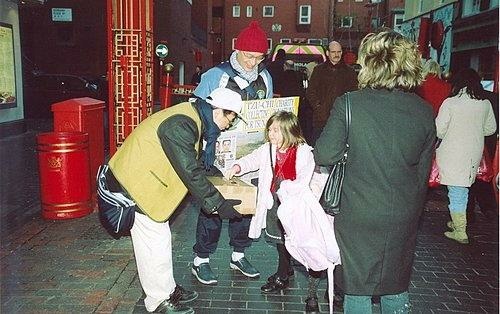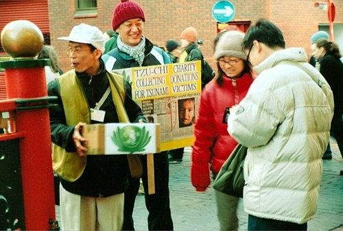 除了年長的師兄、師姐們外,還有許多在英國留學的年輕師弟、師妹們更是賣力積極,一位小女生站在路邊手舉著海報牌,不斷嘶聲力竭的大聲呼喊請人募捐,讓我看得目瞪口呆,滿心羞愧,我算什麼呀!比不上老的也比不上小的,而那些賣力勸募的老老少少們,我站在旁觀者的立場看著他們,一點也不覺得他們有什麼卑微或羞愧,正如那位老師兄所說的:心中有愛,自然心安理得且理直氣壯。於是我又重新站上街頭,我理直氣壯的大聲向路人要錢,我也柔性的勸說人們發揮人溺己溺的精神,我聲音洪亮、我眼神堅定,我用各種身體語言去影響、去感動、去說服那些原本猶豫不決、本來不想或漫不經心的路人,讓他們將口袋中購物找回的零錢,順手投進我的捐款箱中,我懷著真心誠意向那些捐款的善心人士鞠躬致謝,許多帶著小孩的父母們,並不直接將錢捐入,而是透過小孩的手,讓他們的小孩從小就學會愛心捐助,我一個大男人,滿懷謙卑與感恩的蹲下來接受這些小天使們的捐款。