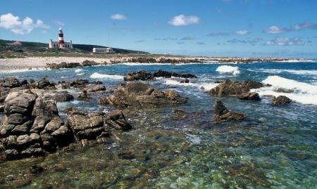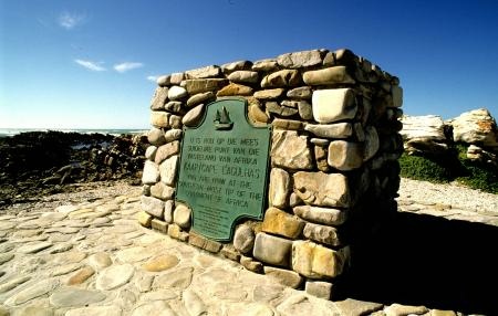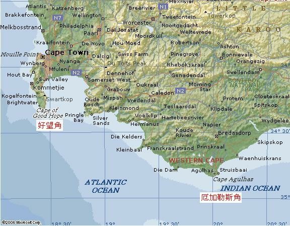 相信各位在學生時代讀世界地理的時候,對於非洲的最南端是何處?應該都有點印象,是「好望角」嗎? (Cape of Good Hope),至少教科書上是這樣寫的,考試的時候若寫的不是「標準答案」肯定扣分,但盡信書不如無書,標準版的教科書內容不一定是「真理」,當年我們在國內唸的「國內」地理與世界地理,等到了國外才發現我們對於「國內」的定義與世界版圖的認定,與外面世界是有差異的,因此所有在台灣出版的地圖,不管是「國內」地圖還是世界地圖,都必須先通過內政部審定才能發行,在國外買的地圖進海關時一律沒收。話題扯遠了,不過關於非洲最南端,我可以肯定的告訴各位不是「好望角」,而是距離「好望角」147公里的Cape Agulhas(請參閱地圖),這個地方跟有名的「好望角」比起來可說是沒沒無聞,因此連個正式中文譯名都沒有,若按照音譯,可稱為「厄加勒斯角」(按照中國大陸的翻譯),原文是葡萄牙文,因為不論是「好望角」或是「厄加勒斯角」當年都是葡萄牙人發現的,英文譯成"Cape of Needles",Needles是針頭的意思,被針頭刺到絕對不好受,當年帆船時代的水手形容經過這裡就好像被針刺一樣,可見這裡海象惡劣、氣候險惡,令水手視為畏途。