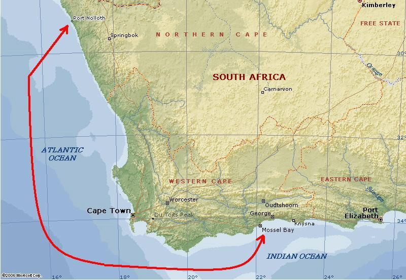 既然向西航行到不了亞洲(倒是無意間發現了美洲),向東航行穿過直布羅陀海峽進入地中海也是死路一條(當時蘇伊士運河尚未開鑿),那只有沿著非洲大陸一路南下,可是非洲大陸的海岸線好像永遠都走不到盡頭,像萬里長城般的橫亙在那裡阻擋了往東的航路,當時葡萄牙人不斷的派遣探險隊沿著非洲西岸向南摸索,最南摸到了非洲的剛果河出海口,再往南就是一片空白了,1487年8月,有個叫Bartolomeu Dias的,中文譯名簡稱他為迪亞士吧,當年他32歲奉葡萄牙國王之命,率3艘探險船沿非洲西海岸南下,繼續尋找駛往東方的未知航路,當船隊開到了南緯29度的Port Nolloth時(見圖解)遇上了風暴,在海上隨風漂流了13個晝夜,等風暴平息以後早已不見陸地的蹤影,迪亞士决定向東航行,因為根據他沿著非洲西岸一路南下的經驗,那條像萬里長城般似乎永遠沒有盡頭的非洲海岸線,一定在東方的某處,可是一連航行了好幾天仍未發現陸地的影子,迪亞士判斷船隊可能在風暴中已經繞過了非洲的最南端,於是命令船隊改變航向朝正北航行,幾天之後果然看見了東西走向的海岸線和一個可以下錨停泊的小海灣「Mossel Bay」(見圖解),這一天是1488年2月3日,迪亞士的探險船隊在風暴中不知不覺的已經越過了非洲最南端,向東望去已經不再有任何陸地的影子,通往東方的新航路至此確定,但是望著一望無際的大洋,探險船隊的船員們在飽受驚濤駭浪的海上風暴肆虐之餘,已經沒有膽再繼續往前航行,迪亞士無奈只有循原路打道回府,1488年5月在返航的途中,船隊來到一個突出的岬角,這時風暴再起,海面巨浪滔天。船隊在風浪中經過兩天奮力搏鬥,才繞過駭人的海角,向北駛入了風平浪静的非洲西海岸,望着這個令人生畏的海岬突角,迪亞士將它命名為「風暴角」(Cape of Storms),1488年12月,探險船隊返回葡萄牙的里斯本,迪亞士向葡萄牙國王約翰二世(John II)描述了自己的探險經過和命名為「風暴角」的海角,國王認為,繞過這個海角就有希望到達東方朝思暮想的黄金國「印度」,等於開啟了歐洲直通亞洲的貿易新航路,於是就將「風暴角」改名為「好望角」(Cape of Good Hope),並一直沿用至今,所以說「好望角」的發現其實是一個誤打誤撞的「意外」。