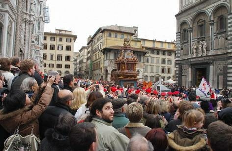 2008年3月23日星期日,我流浪到義大利的翡冷翠,這一天是復活節也是天主教最盛大的節日,不過天氣不太好,一早出門就彤雲密佈一付要下雨的天色,來到聖母百花大教堂(Saint Maria of the Flower)前面的廣場,只見人山人海、鐘鼓齊鳴好不熱鬧,我這個人最喜歡湊熱鬧、看熱鬧,當年在南美智利還因為湊熱鬧差點被當成「異議份子」抓進囚車,原來那是當地反政府示威活動。