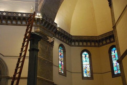 在祭壇的前方立了一根柱子,約兩層樓高,上面拉了一根細鋼絲,貫穿教堂的中間走道,一直連到外面的聖母神轎上,那根細鋼絲上面繫了一隻白色的鴿子(人造的假鴿子),這是在幹什麼呢?先賣個關子,下面分曉(其實當時我也不知道)。