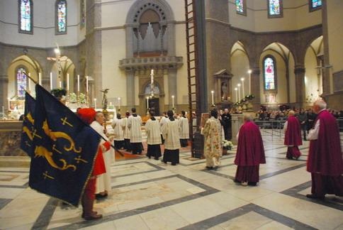 在聖樂的引導下,主教出現了,他領著一群神職人員走出大門迎接聖母神轎,這些人在外面搞了些什麼?我這個站在最裡面的「觀光客」可一點也看不到,等這些人再回到教堂各就各位後,彌撒的儀式就正式開始了,此時在祭壇的右邊,突然出現一個來鬧場的,跨過隔欄就要衝上祭,但隨即被不知哪冒出來的安全人員強行拖走,行動很有效率又隱密,四個大漢沒讓他出聲就把他架離現場,還有人把掉在地上的鞋子也撿走,要不是在第一排還真不知道發生什麼事,現場沒有引起任何騷動。