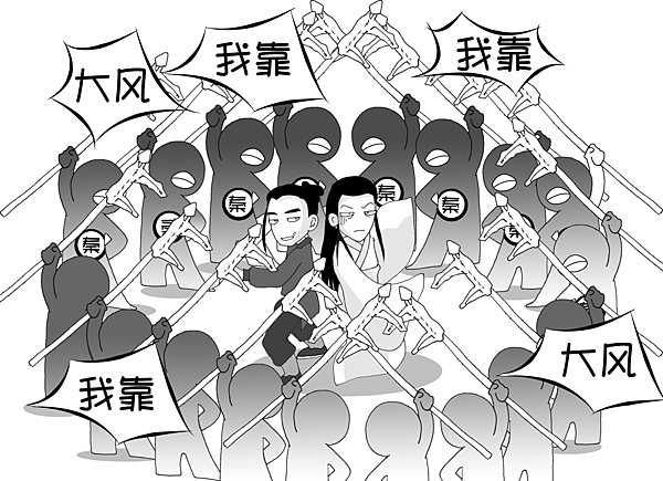 在「英雄」這部電影裡,張藝謀導演讓那些秦國士兵在戰鬥時一邊以劍敲盾,一邊高呼「大風、大風、大風」,我當時看的時候不甚理解,幹嘛扯上「風」啊?現在可弄明白了,原來翻成現代白話就是「我靠、我靠、我靠」。
