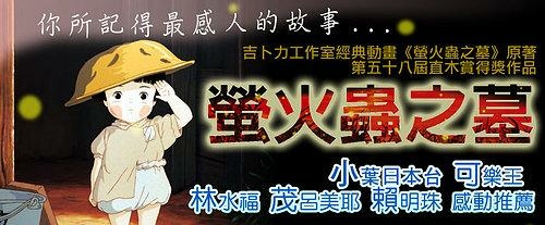 「螢火蟲之墓」是描寫二次大戰時一對小兄妹,父親被征招參戰生死未卜,母親在美軍空襲時炸死了,他們的房子也被轟炸夷為平地,兄妹倆只有投靠住在鄉下的親戚家,但是因為戰事日趨吃緊,政府的補給品也越來越少,親戚的冷漠嘲諷逼使兄妹離家過活。哥哥揹著妹妹找到一個無人山洞,過著有一餐沒一餐的日子,唯一的慰藉就是抓取閃閃發亮的螢火蟲,在漆黑的夜裡求得心靈上的暫時寧靜。