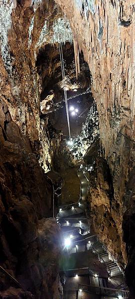溶洞內常年溫度只有11度,夏天來算是滿消暑的,這個溶洞的特點是巨大的拱型洞穴,離地表深達120公尺(洞穴巨大的尺寸是列入Guinness世界紀錄的),進去看到深達40層樓的洞穴(場面壯觀),心想這40層樓走下去還要爬上來,兩腿就開始發軟了,沒辦法,頭已經洗了非剃不可,也就只能硬著頭皮走下去再爬上來,腿腳不好的千萬別下來,不然下去爬不上來可就鬧笑話了,再重見天日時已經在另一端,當我氣喘吁吁的爬上來後,一家餐廳就在出口處等著我們這些又渴又累的觀光客,我的午餐就在那餐廳解決的,我發覺同團的觀光客幾乎無一例外的,全都進了這家餐廳報到。