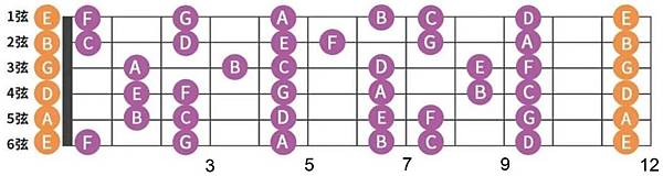 吉他的自然大調音階,每一個音名的位置如下圖,雖然吉他指板的格數不只十二格,但因為音階的八度音是由十二個半音所組成,因此超過十二格之後,音名又將回到各弦的開放音(只是高了八度音),所以十二格以後的音名位置又將重複,因此音名位置圖只到十二格。